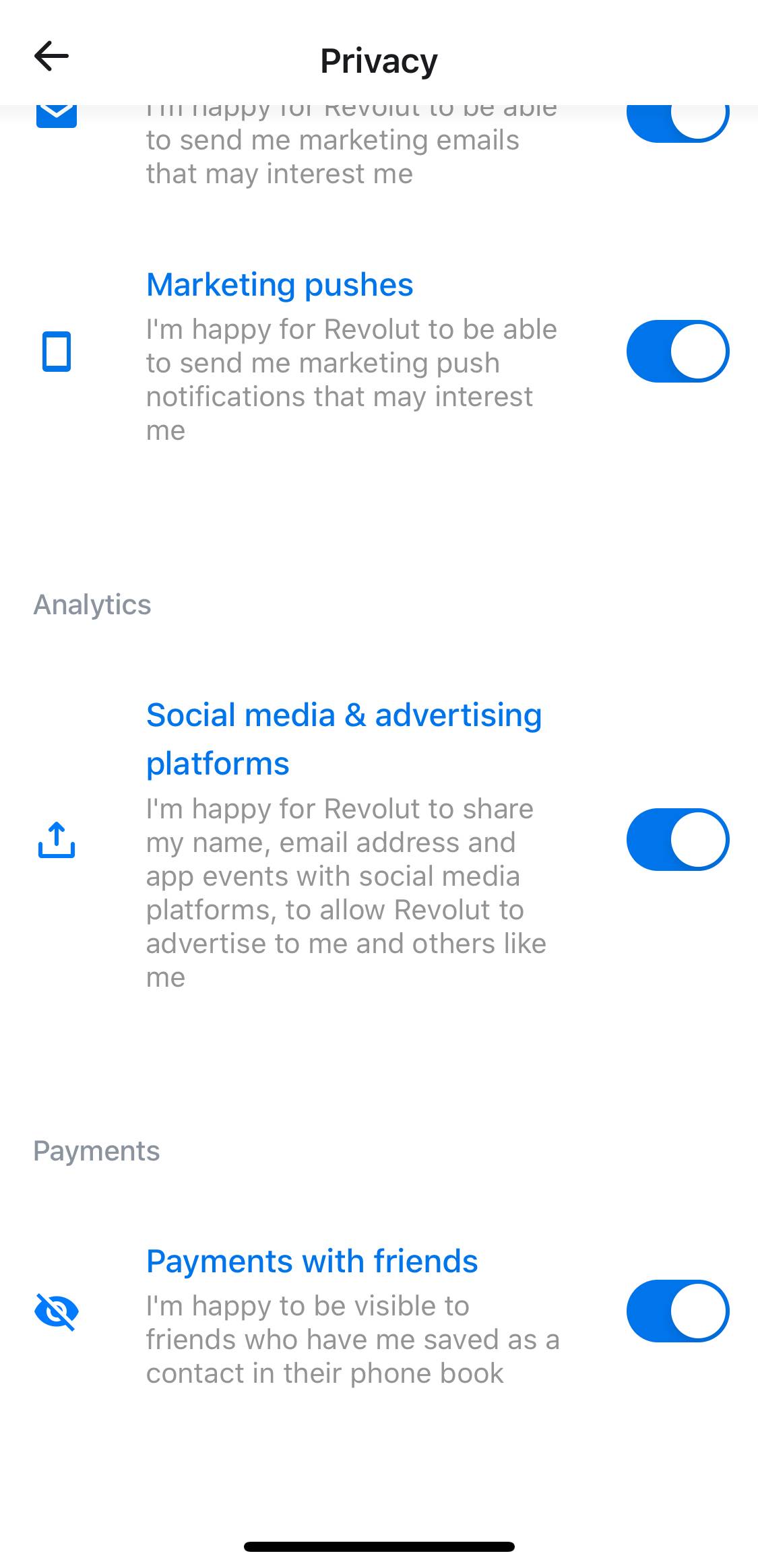 Please note: You will need to update to Revolut version 6.18 or later in the App Store or Play Store, in order to see both of the opt-out switches we’ve described above in your privacy settings.