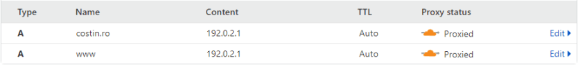 6. șterge tot ce vezi în DNS și adaugă cele două linii ca în articol (folosind chiar acel IP). Rezultatul va fi puțin diferit față de imaginea de acolo, în ideea in care  Cloudflare va adăuga numele domeniului tău în loc de @ când salvezi acea modificare