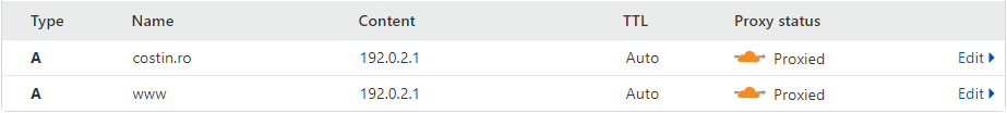 6. șterge tot ce vezi în DNS și adaugă cele două linii ca în articol (folosind chiar acel IP). Rezultatul va fi puțin diferit față de imaginea de acolo, în ideea in care  Cloudflare va adăuga numele domeniului tău în loc de @ când salvezi acea modificare