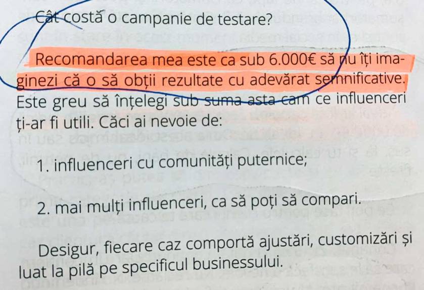 Cartea tratează extrem de superficial costurile unei campanii cu influenceri / creatori de conținut, setând așteptări total nerealiste pe care le-ar putea avea zona profană înainte de a face măcar o primă campanie de test cu influenceri. Evident, autorul ar fi putut afla aceste lucruri foarte ușor (dacă nu le știe deja) având, la un tap distanță, prieteni apropiați prin diferite agenții. De la CSs până la șefi de agenții.