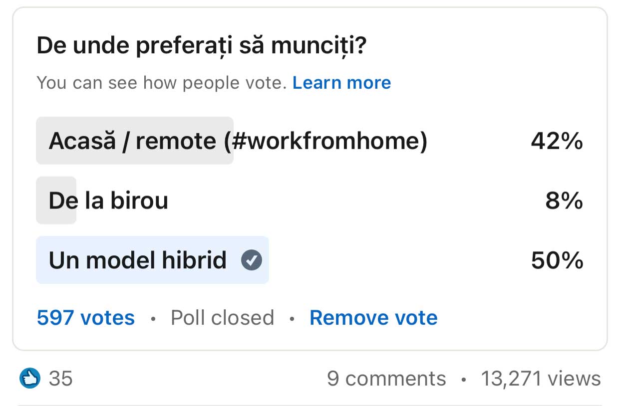 Un poll pe care l-am publicat pe LinkeIn și la care au răspuns aproape 600 de profesioniști arată cam aceleași lucruri. Doar 8% doresc întoarcerea la birou, 50% vor un sistem hibrid, iar doresc să muncească de acasă.