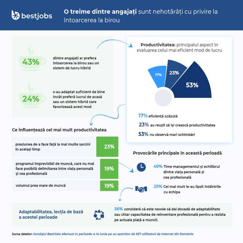 Azi, Bestjobs a dat publicității rezultatele unui alt studiu ale cărei concluzii principale sunt că 43% dintre angajați ar prefera întoarcerea la birou sau un sistem de lucru hibrid, un sfert preferă să muncească de acasă, iar o treime sunt nehotărâți în ceea ce privește întoarcerea la birou.