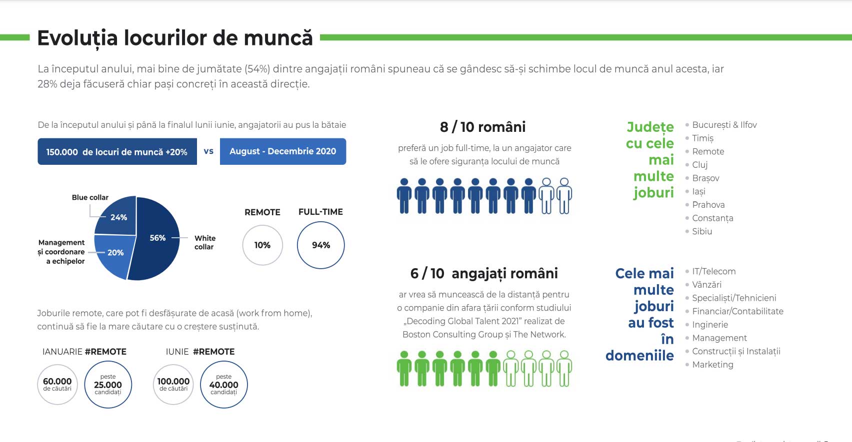 Mai mult de jumătate dintre respondenți (56%) au ajuns la concluzia că pentru a rezista pe actuala piață a muncii, modelată de pandemie, este nevoie să dai dovadă de adaptabilitate sau chiar capacitatea de reinventare profesională. 21% consideră că le-a fost de folos rezistența la stres și efort. 11% pun accent pe comunicare și tot atâția pe competențele digitale.