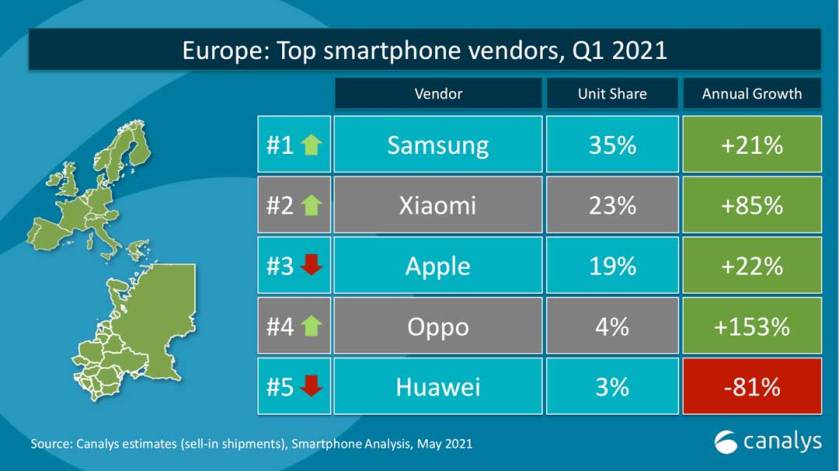 De menționat ar fi faptul că top 5 al pieței globale de smartphone la jumătatea lui 2021 este dominat de o companie coreană (Samsung) și 3 companii din China, Apple fiind singura companie din afara Asiei care se regăsește în acest top. Europa nu mai are niciun reprezentant, Nokia fiind ultima companie care și domina de departe aceste topuri în urmă cu 10 ani.