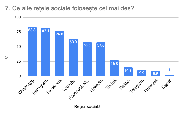 Instagram, Facebook și Youtube sunt cele mai utilizate rețele sociale de către utilizatorii de Clubhouse din România, cu peste 80% în cazul primelor două și 3/4 dintre repondenți în cazul Youtube. TikTok raportează un sfert, iar clasamentul este închis de Signal, o aplicație de mesagerie instantanee criptată adăugată de un repondent (nu se afla în lista inițială).