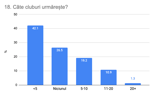 Unul din trei repondenți nu este înscris în niciun club, în timp ce 36.4% sunt membri a unui număr de maxim 5 cluburi. Procentul crește la 42.1% când vine vorba despre cluburile pe care le urmăresc, în timp ce un procent de 1.3% urmărește peste 20 de cluburi, iar 2.6% dintre repondenți sunt membri ai unui număr de peste 20 de cluburi.