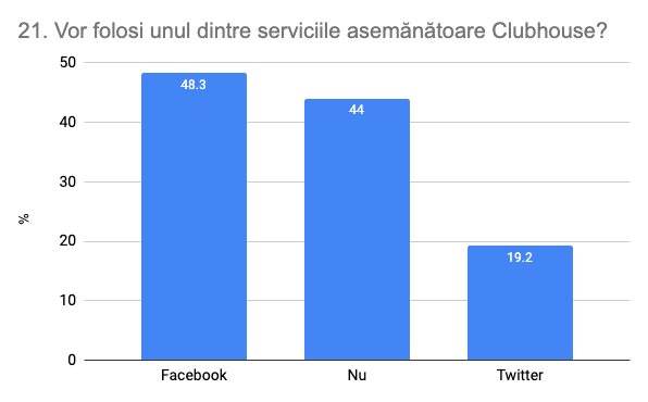 44% dintre utilizatorii de Clubhouse din România au declarat că nu vor folosi un serviciu asemănător Clubhuose dezvoltat de o altă rețea socială. 19.2% merg pe mâna Twitter (au fost câteva roomuri în România pentru cei care au primit deja Spaces), în timp ce aproape jumătate vor testa / folosi și varianta celor de la Facebook. Citește și A picat Clubhouse. Facebook lucreaza la o copie a retelei sociale, Twitter testeaza Spaces.