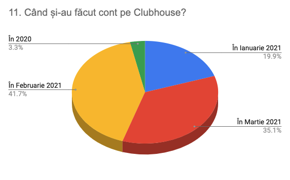 Mai mult de jumătate dintre utilizatorii de Clubhouse din România au aflat de existența rețelei sociale cel mai probabil de pe Instagram și Facebook, în timp ce 1/3 dintre repondenți au primit direct o invitație de la un cunoscut care avea numărul acestuia în agenda telefonului. Aproape jumătate și-au făcut cont în luna Februarie.