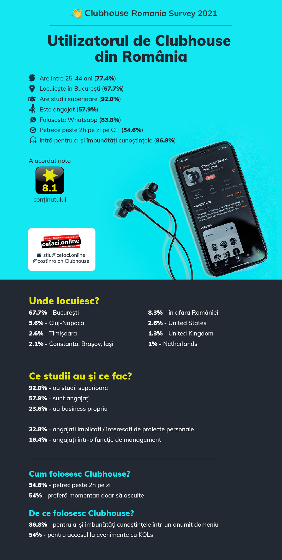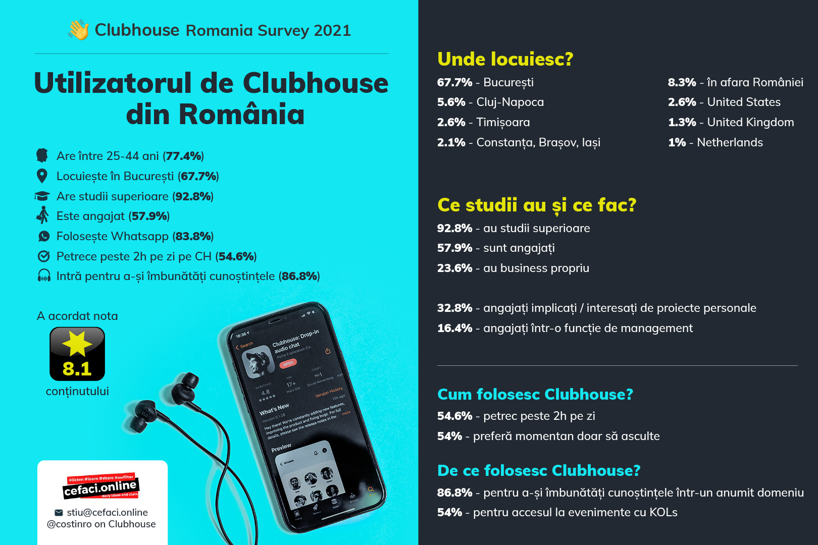 În martie, cefaci.online a lansat “👋 Clubhouse România Survey 2021”, primul studiu din România realizat pe audiența Clubhouse. Inițiativa își dorește să ofere companiilor, agențiilor de publicitate, PR, marketing și media, dar și publicului larg interesant de trendurile în Influencer Marketing (marketingul cu ajutorul influencerilor), primul profil al utilizatorului de Clubhouse din România
