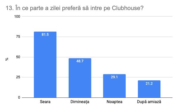 Un procent de 81.1% dintre românii care au cont pe Clubhouse preferă să se conecteze seara în timp ce, la polul opus, doar 1 persoană din 5 poate fi găsită online după amiaza. Ziua preferată este vinerea, urmată de sâmbătă și de miercuri, în timp ce marțea pare ziua cea mai nepotrivită în a deschide un room.