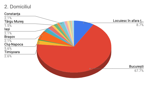 Mai mult de jumătate dintre repondeți au terminat un master sau doctorat. Vorbim despre 56.9%, un procent care mă face să cred că majoritatea celor cu vârste cuprinse între 25 și 44 de ani au, de fapt, sub 35 și au prins sistemul de învățământ universitar de tip Bologna, cu 3 ani de facultate și 2 de master. Acest lucru se poate observa și mai jos, la domeniile de activitate.
