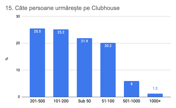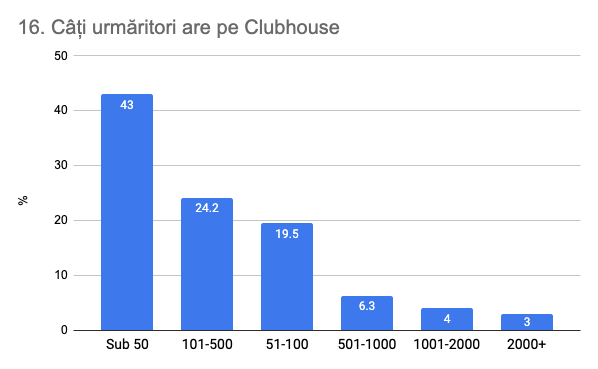 Numărul urmăritorilor utilizatorilor din România de Clubhouse este de ordinul miilor, 4% având între 1001 și 2000 de followers, în timp ce doar 3% au peste 2000 de followers. Altfel, peste 50% urmăresc mai puțin de 200 de alte conturi, în timp ce aproape jumătate au mai puțin de 50 de followers.