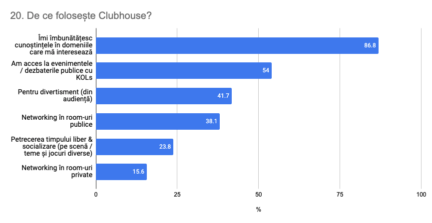Motivul principal pentru care intră pe Clubhouse este acela de a-și îmbunătăți cunoștințele (86.8%), urmat de faptul că, în contextul actual al pandemiei și distanțării, noua rețea socială le oferă acces la dezbateri și evenimente cu Key Opinion Leaders (54%).