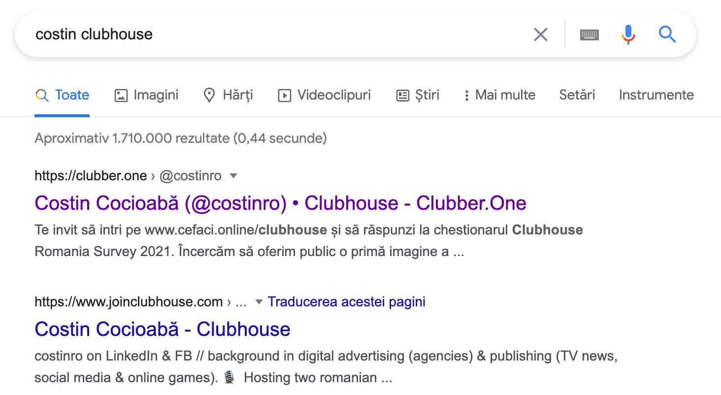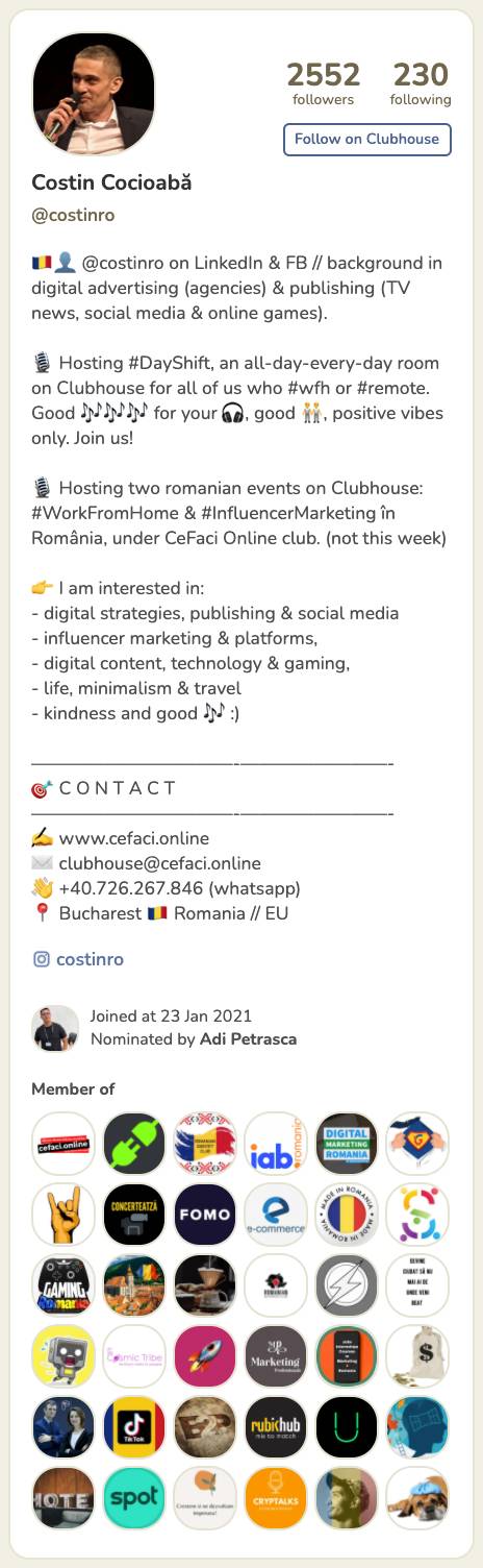 Pentru alte detalii referitoare la Clubhouse ne puteți contacta la telefon 0726.267.846, email stiu@cefaci.online, ori pe Clubhouse (@costinro).
