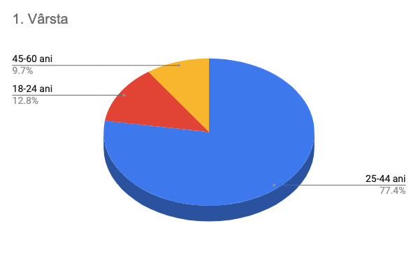 O majoritate covârșitoare a repondențior (77.4%) au vârsta cuprinsă între 25 și 44 de ani. Aproape 13% sunt tineri cu vârsta cuprinsă între 18 și 24, în timp ce 10% din totalul celor care au răspuns chestionarului au peste 45 de ani.