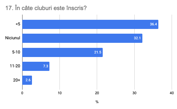 Unul din trei repondenți nu este înscris în niciun club, în timp ce 36.4% sunt membri a unui număr de maxim 5 cluburi. Procentul crește la 42.1% când vine vorba despre cluburile pe care le urmăresc, în timp ce un procent de 1.3% urmărește peste 20 de cluburi, iar 2.6% dintre repondenți sunt membri ai unui număr de peste 20 de cluburi.