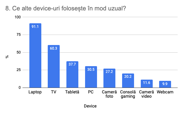 Laptopul este cel mai folosit device (pe lângă telefonul mobil cu care intră pe Clubhouse, ori au completat acest studiu) de către utilizatorii de Clubhouse din România, procentul fiind de 91.1% din totalul repondenților studiului. Doar 1/3 folosesc un desktop, procentul celor care au o tabletă fiind mai mare (37.7%)