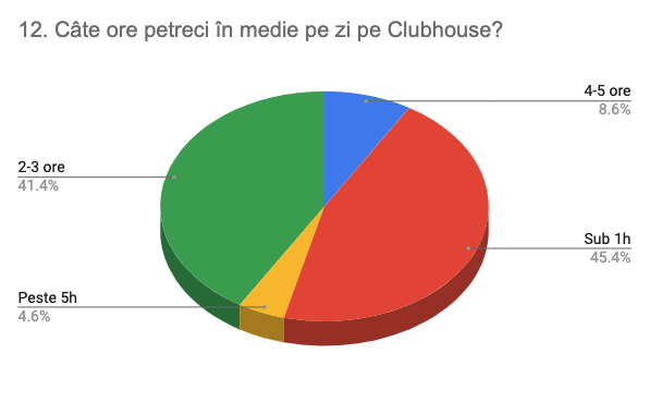 Peste jumătate petrec peste 2h pe zi pe Clubhouse, iar un procent de aproape 5% petrec peste 4.6h pe Clubhouse. Nu vă mirați, sunt camere cu muzică, de exemplu, și persoane care muncesc de acasă, Clubhouse fiind un mediu perfect pentru a asculta și a discuta din când în când cu alți oameni ce împărtășesc aceeași industrie, de exemplu.