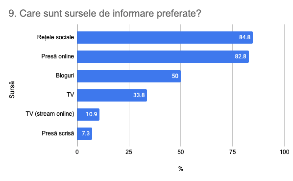 Blogurile au fost semnalate ca sursă preferată de informare de jumătate dintre utilizatorii de Clubhouse din România, în timp ce TV-ul raportează 33.8 procente, un pic mai bine decât jumătatea celor care dețin un TV în casă, ceea ce înseamnă că îl folosesc pentru aplicații (ex. YT, Netflix) și/sau jocuri pe consolă, device deținut de 20.2% din totalul repondenților.