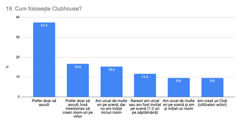 37.4% preferă doar să asculte în camere de discuții (rooms) publice, iar un procent de 16.6% intenționează să creeze room-uri în perioada următoare. Un procent de 19.2% sunt utilizatori activi, cu nenumărate room-uri create, ori care dețin deja un Club în cadrul rețelei sociale.