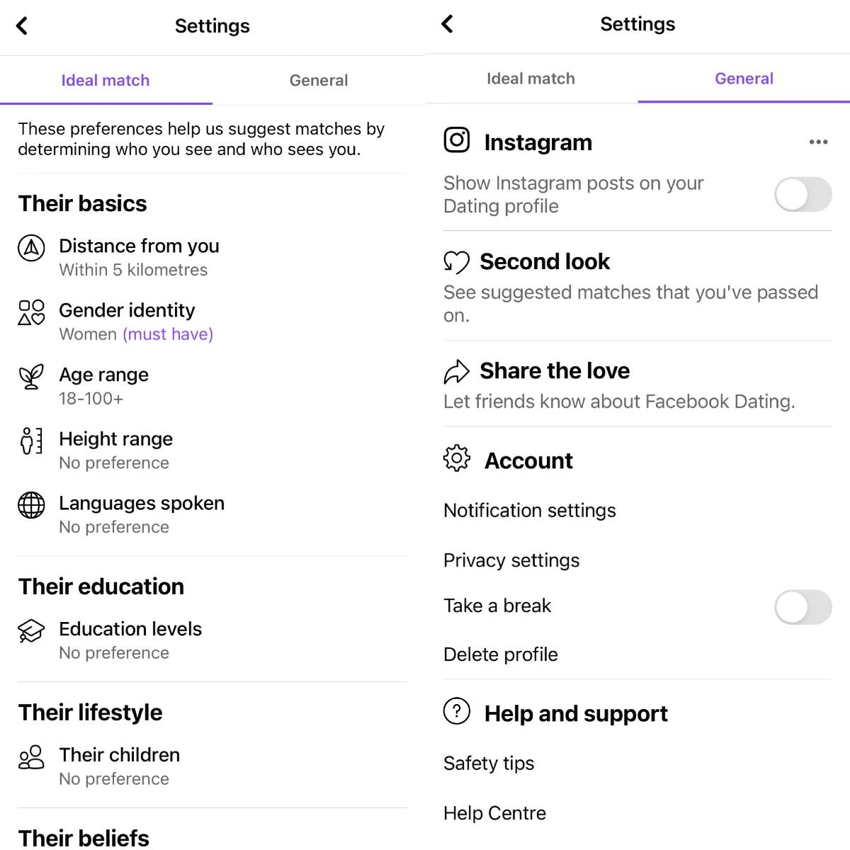 Revenind la cont, secțiunea setărilor Facebook Dating este împărțită în 2: Ideal Match și General. În prima parte îi dai de lucru algoritmului să-ți caute fix sufletul pereche pe Facebook :), în timp ce în General poți face diferite setări precum afișarea fotografiilor de pe Instagram, ori posibilitatea de a te întoarce la sugestiile pentru care ai dat deja swipe left. Hellooo, Tinder Plus!