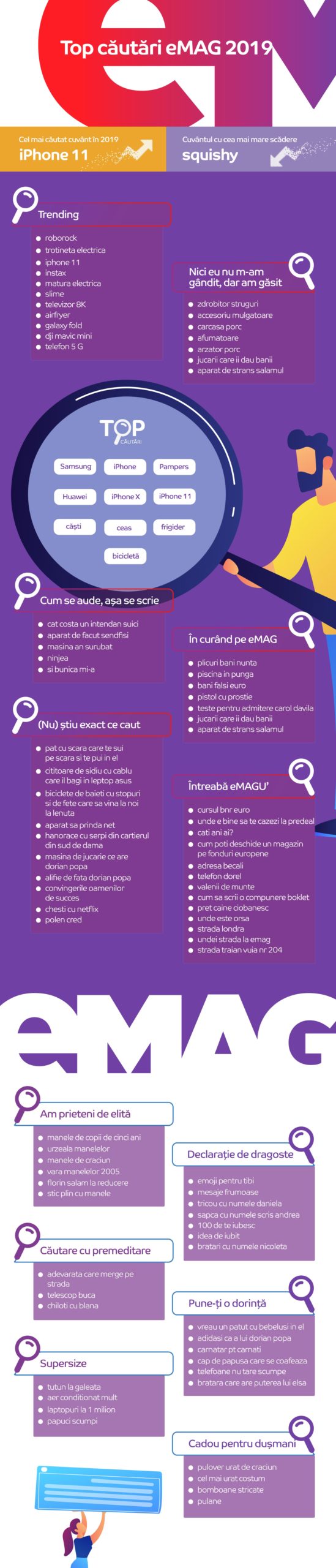 Topurile amuzante le găsiți în infograficul și detaliile de mai jos, între timp vă rețin atenția cu topul celor mai căutate produse pe eMAG în 2019, top în care iPhone ocupă 3 poziții, inclusiv prima. N-ar trebui să fie neapărat o supriză, iPhone este, totuși, cel mai căutat cuvânt pe Google în 2019 în România.