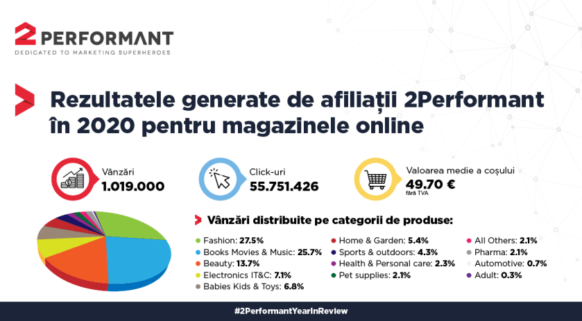 Detaliile le găsiți aici – vorbim despre peste 1 milion de vânzări (+28% față de 2019) din 55 de milioane de click-uri generate pentru cele 785 de magazine online înscrise în platformă de către aproape 3500 de afiliați, care, în 2020, au câștigat 3,4 milioane de euro din comisioane prin intermediul 2Performant (+26,8% față de 2019).