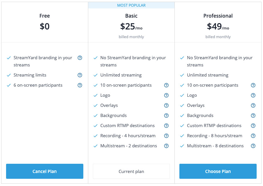 Clickmeeting nu e o platformă gratuită. Ai 7 zile la dispoziție să o cumperi, perioadă în care ai acces limitat precum poți observa și în tabelul de mai jos. Lista completă a diferențelor dintre planurile puse la dispoziție o poți găsi aici. Acum, fiind o platformă de webinarii, planurile sunt pentru webinarii. Pentru live-uri ne interesează în principal numărul de surse video / camere / potențial invitați. Enterprise nu m-a interesat, iar dintre celelalte am ales chiar varianta denumită Live.