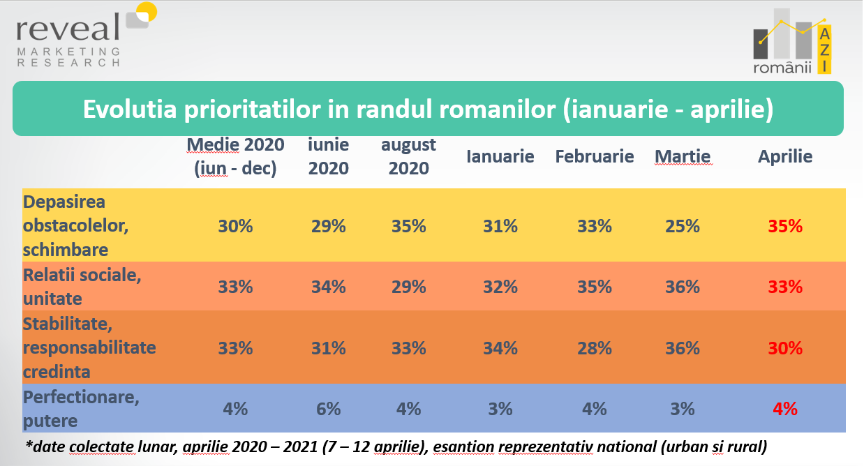 În ceea ce privește priorițile, pe primul loc în aprilie se află teritoriul depășirii obstacolelor și al schimbării, cu o creștere de 10% față de luna martie. Această lună înregistrează cele mai ridicate procente din acest an, probabil datorită nevoii românilor de a schimba ceva în viață lor după un an de pandemie, de restricții și de distanțare socială. Teritoriul relațiilor sociale și al unității trece pe locul doi în motivațiile românilor în această luna, cu o scădere de 3% comparativ cu martie.