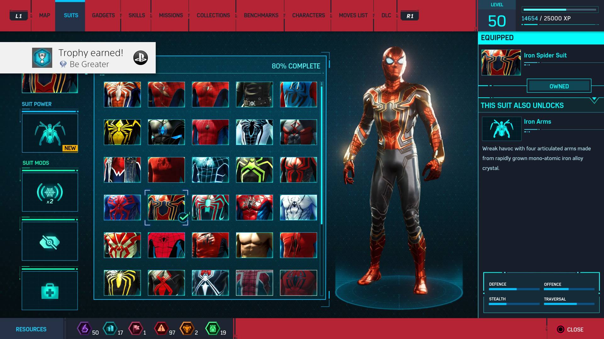 Și, în plus, dacă vei face asta, vei putea debloca toate costumele lui Spider-Man înainte de finalul jocului, și nu vei ajunge să iei trofeul de platină, 🏆 Be Greater, în meniul de costume și să și scrii despre asta, ulterior, pe blog. Asta e. Pățăști. 😀