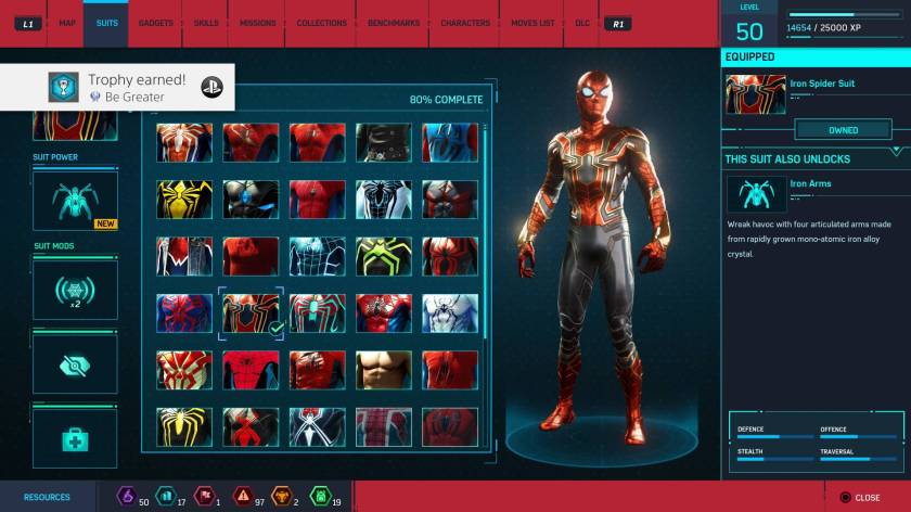 Nu am să intru în detalii, fiecare își va construi povestea jocului după bunul plac – poți fi un Peter Parker Rambo 4, sau cel mai stealth Spider-Man pe care l-ai cunoscut -, însă am să fac o singură observație referitoare la unul dintre trofee: 🏆 A Suit For All Seasons, trofeul de collectables de la Marvel – toate jocurile au un astfel de trofeu.